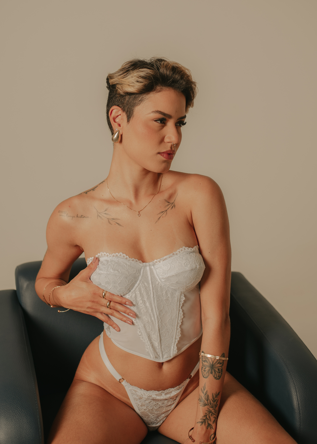 O corset cappuccino é no modelo meia taça, todo estruturado, projetado para realçar e definir a silhueta. Ele é confeccionado em um tecido de renda delicado, criando um visual sofisticado e sensual. O corset tem um corte ajustado que se molda ao corpo, com uma estrutura interna composta por barbatanas, que ajudam a dar forma à cintura e ao busto. As costas são ajustadas com um laço, permitindo um ajuste personalizado.